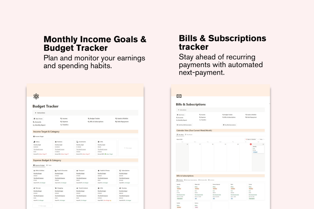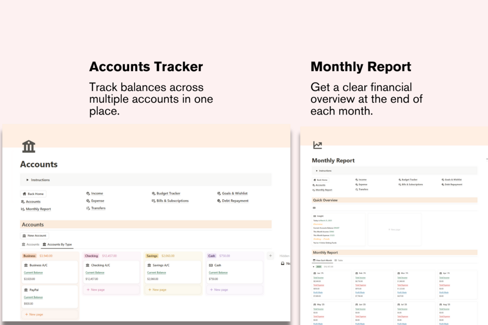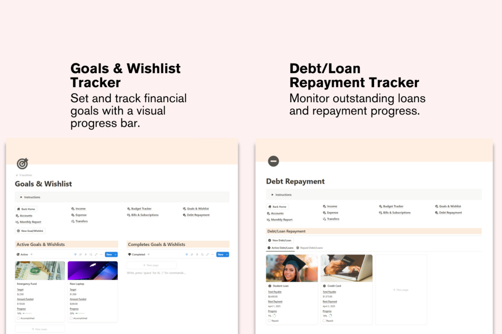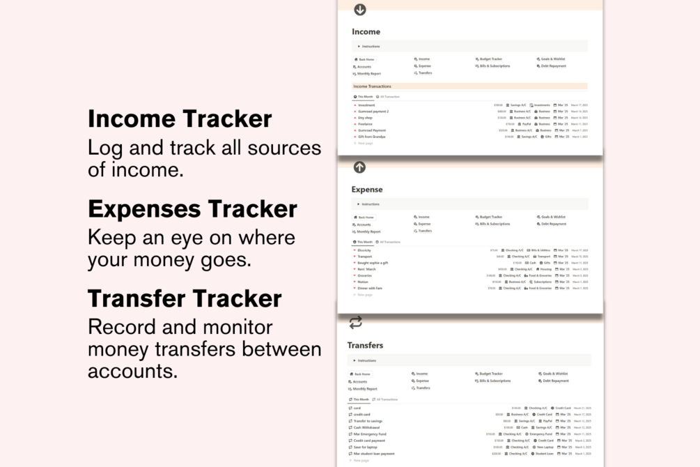 The Finance Tracker Notion Template is designed to help you manage your income, expenses, transfers between accounts, budgets, debt repayment, and financial goals, all in one organized and automated system.