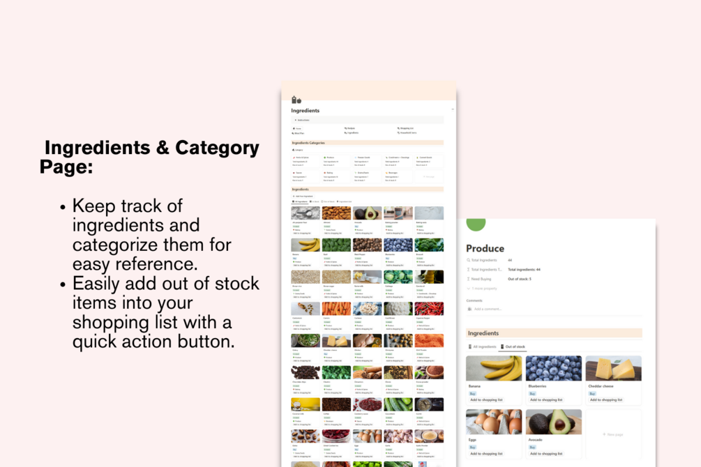 Ingredients & Category Page: Streamline your grocery shopping by categorizing ingredients and keeping a master list for quick reference.