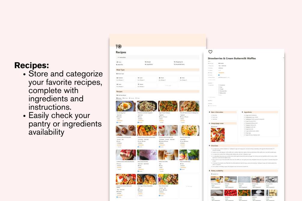 Recipe Page: Save and organize your favorite recipes with detailed ingredients, instructions, and categories for easy access.