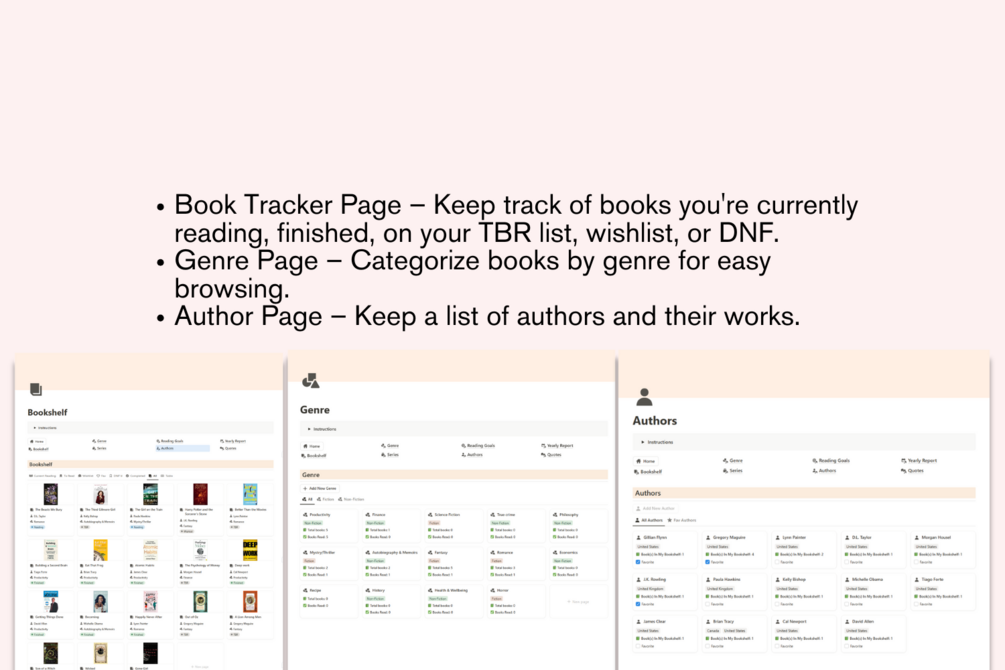 • Book Tracker Page – Keep track of books you're reading, finished, on your TBR list, wishlist, or DNF.