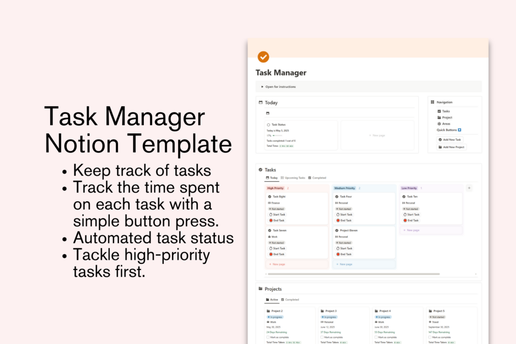 Stay on top of everything from daily tasks to large projects with this all-in-one Task Manager with Time Tracker & Statistics Notion Template designed to boost your productivity, streamline your workflow, and help you finish what you start.