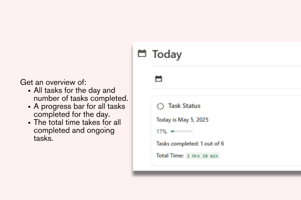 - View the current date, total tasks for the day, completed tasks, a visual progress bar, and total time spent on tasks.