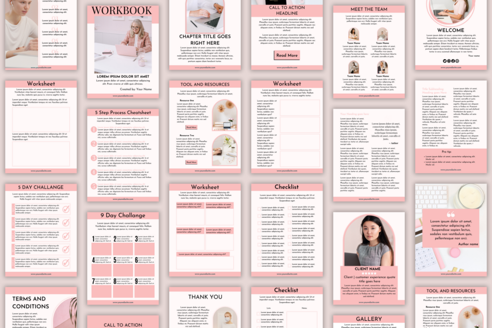 This is a 50+ page template made with Canva. You'll get a mix of content pages, Challenges, cheat sheets, toolkits, worksheets, and checklists.