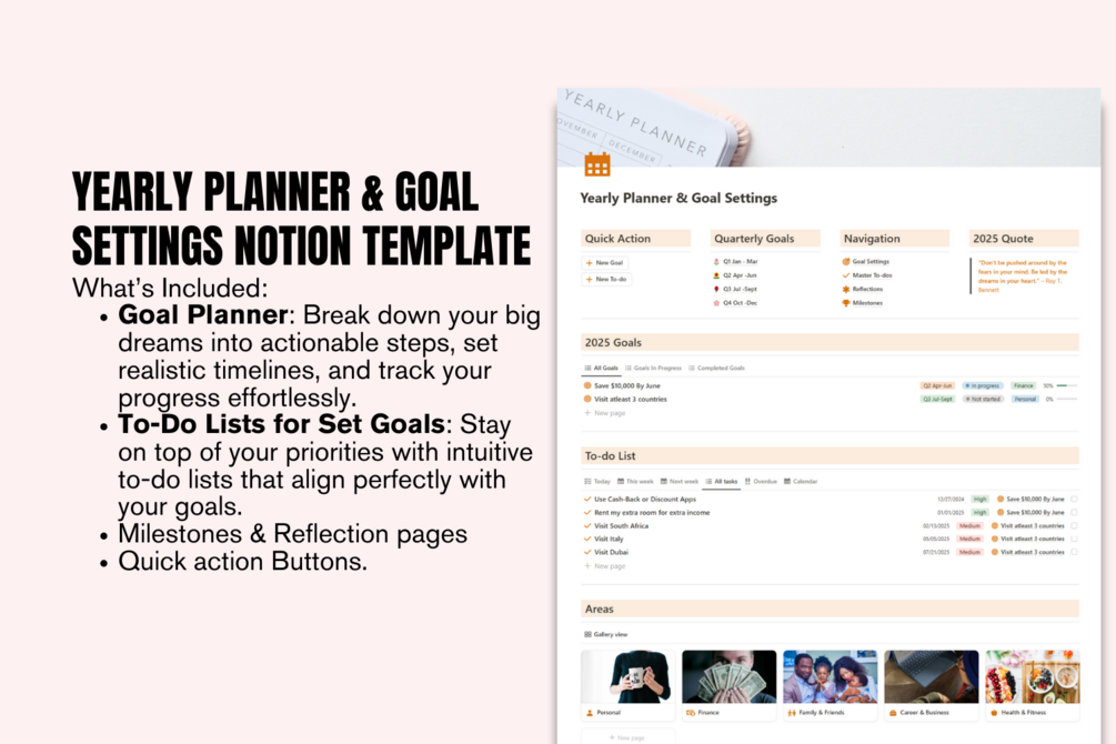 Stay organized and focused all year long with the Yearly Planner & Goal Settings Notion Template!