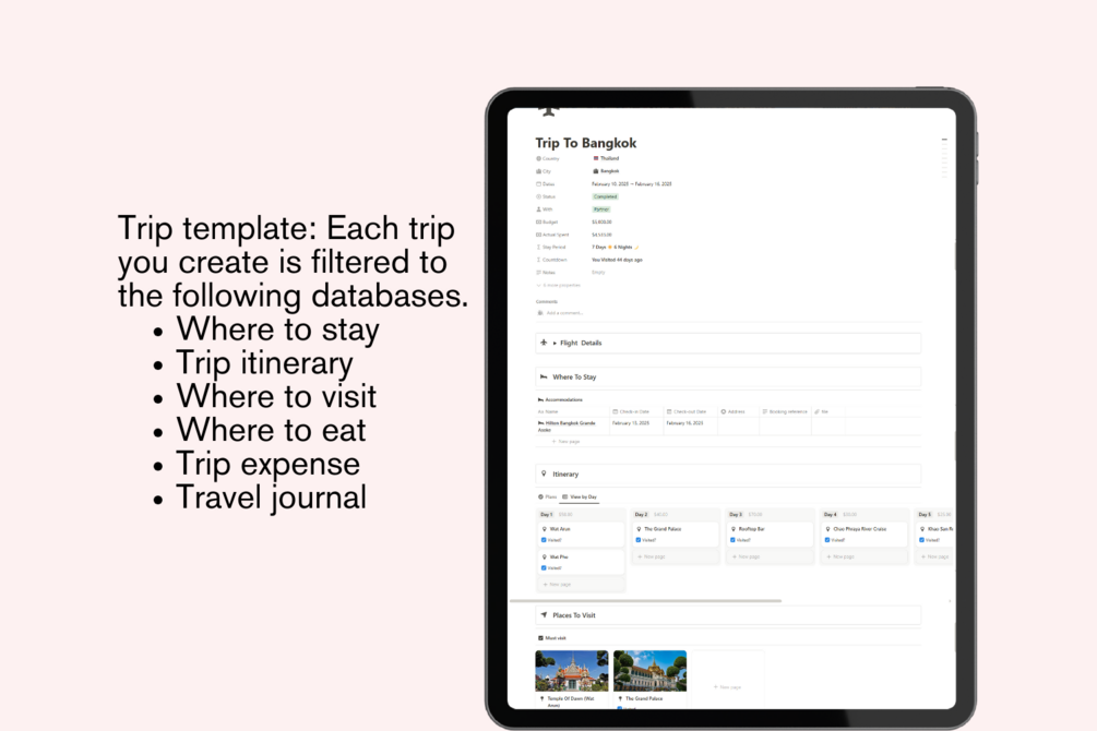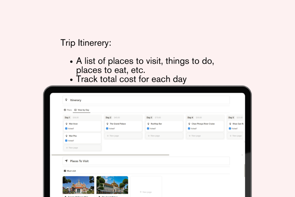 • Trip Itinerary – Plan your days in detail, from must-see attractions to downtime.