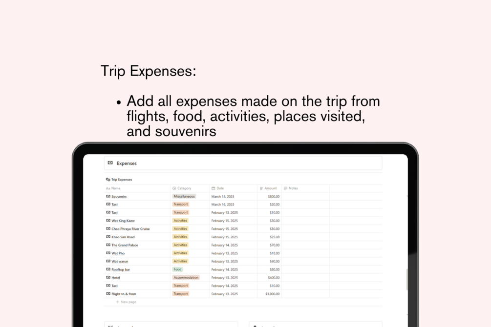 • Travel Expenses – Stay on budget by tracking flights, accommodations, meals, and activities.